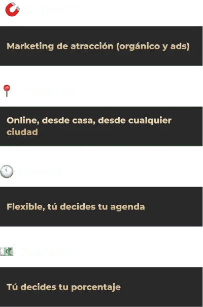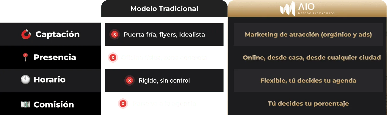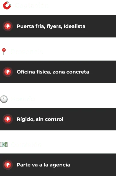 Formas parte de una comunidad de agentes con la que puedes colaborar: tú puedes captar y otro puede cerrar, o viceversa. Así no dependes solo de ti mismo ni de tu ciudad. Esto te da alcance, velocidad y apoyo constante.